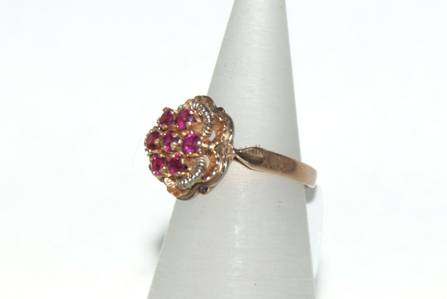Guldring med klare røde sten 18 Karat Stemplet:750 Størrelse: 50 /15,92 mm. Ingen eller næsten ingen brugs slidtage Varen findes ikke fysisk i forretningen Kontakt os for fremvisning