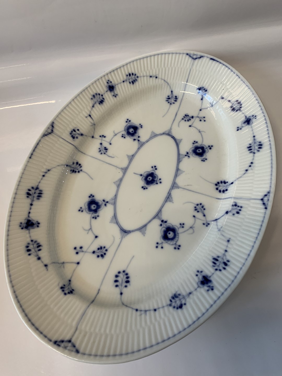 Bing og Grøndahl, Ovalt fad Blåmalet Musselmalet Riflet. Fabriksmærket viser, at fadet er produceret mellem. 1902-1914. Længde 39 cm. Bredde 27,5 cm. 1. sortering. Pæn og velholdt stand.