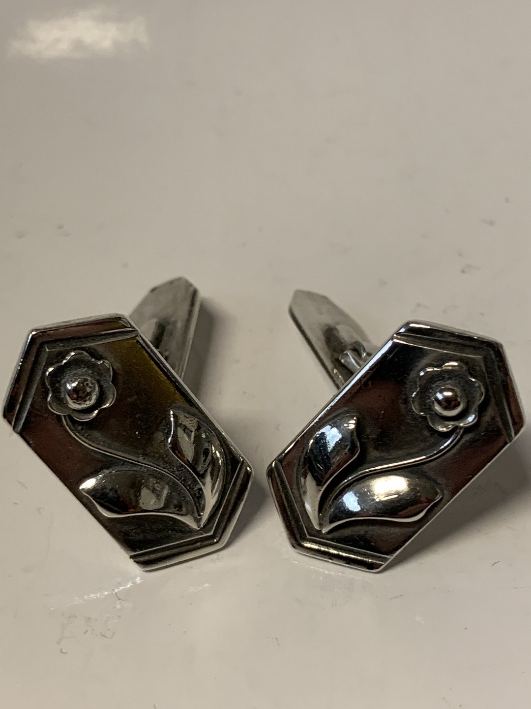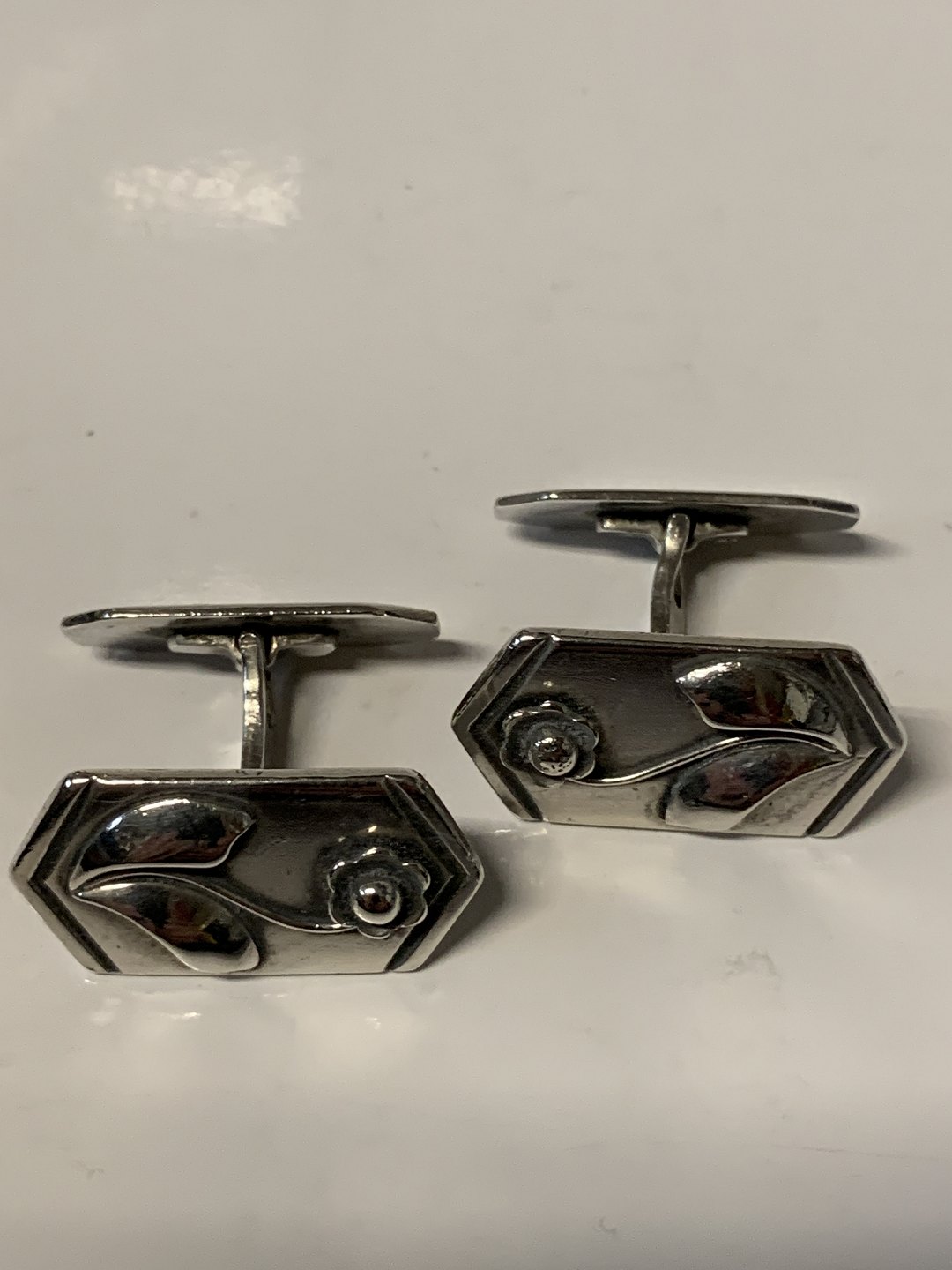 Manchetknapper i sølv Stemplet H.J. 830s Højde 12,45 mm Længde 24,30 mm Se desuden vores store udvalg af smykker hos antikhuset her: https://www.antikhuset.net/katindex.asp?kukat=597