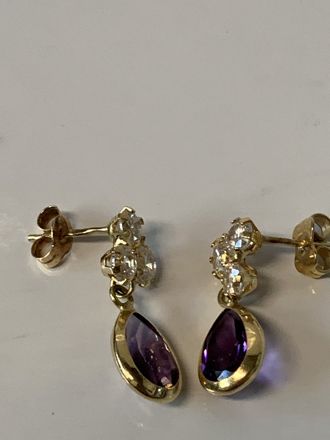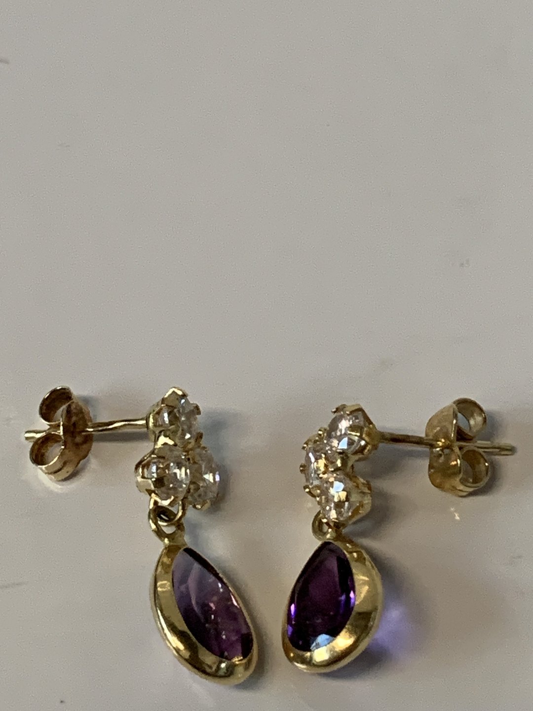 Guldøreringe i 14 karat guld, indlagt ametyst og klare sten.