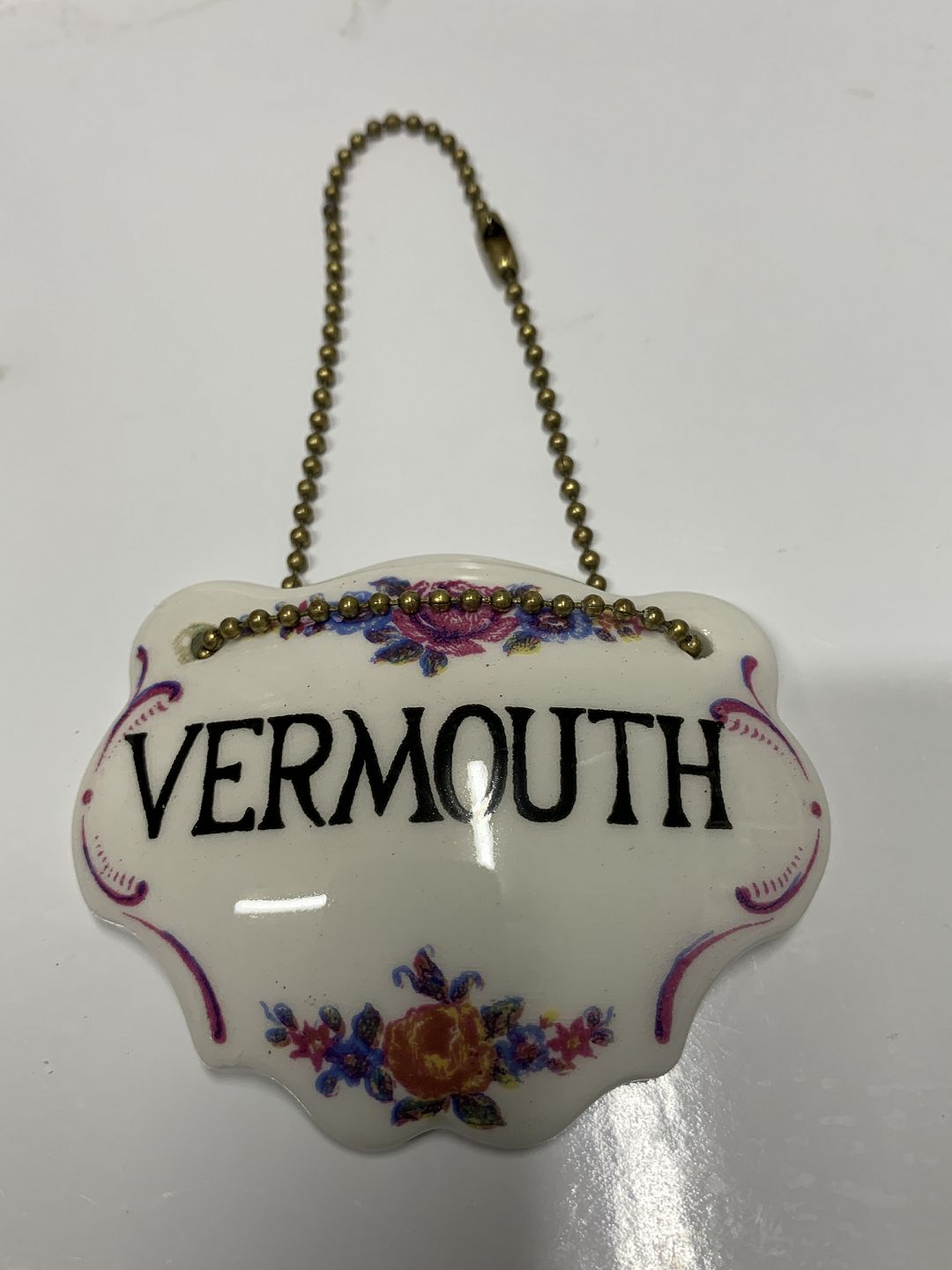 Flaske / Karaffel Vermouth skilt med kæde Størrelse 7 x 5,5 cm. Lille skår på bagsiden se foto ellers velholdt stand,