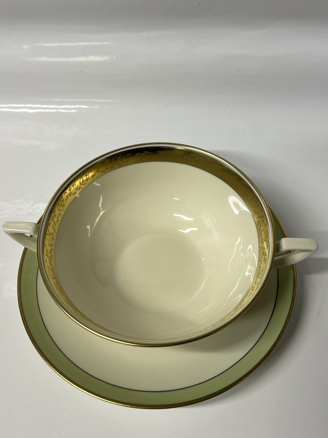 Royal Copenhagen Dagmar bouillonkop med tilhørende underkop. Dekorationsnummer 988/9571. 1. sortering. Diameter på koppen er 12,9 cm. Perfekt stand uden fejl.