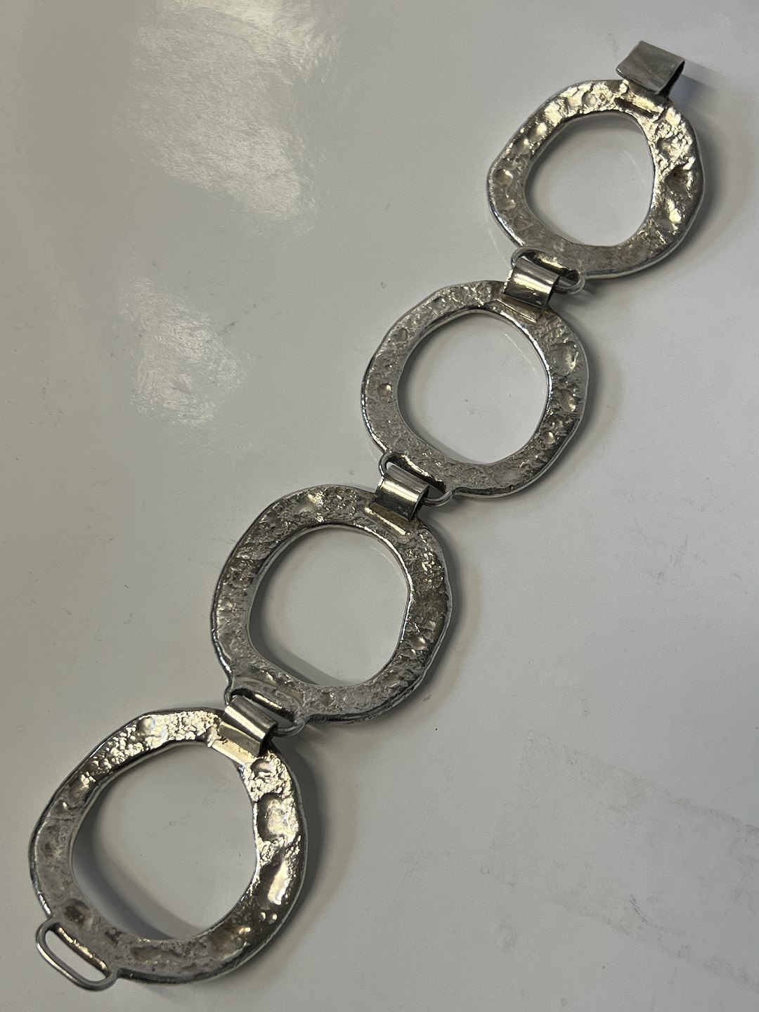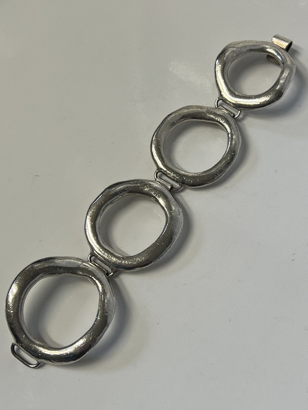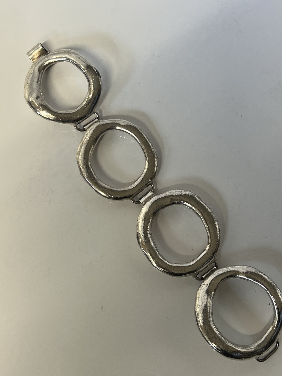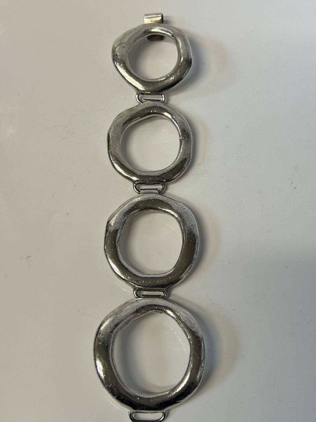 Smukt armbånd, med runde ringe. Meget unikt, og elegant design. Længde 18,5 cm. Bredde 4 cm. Flot og velholdt.