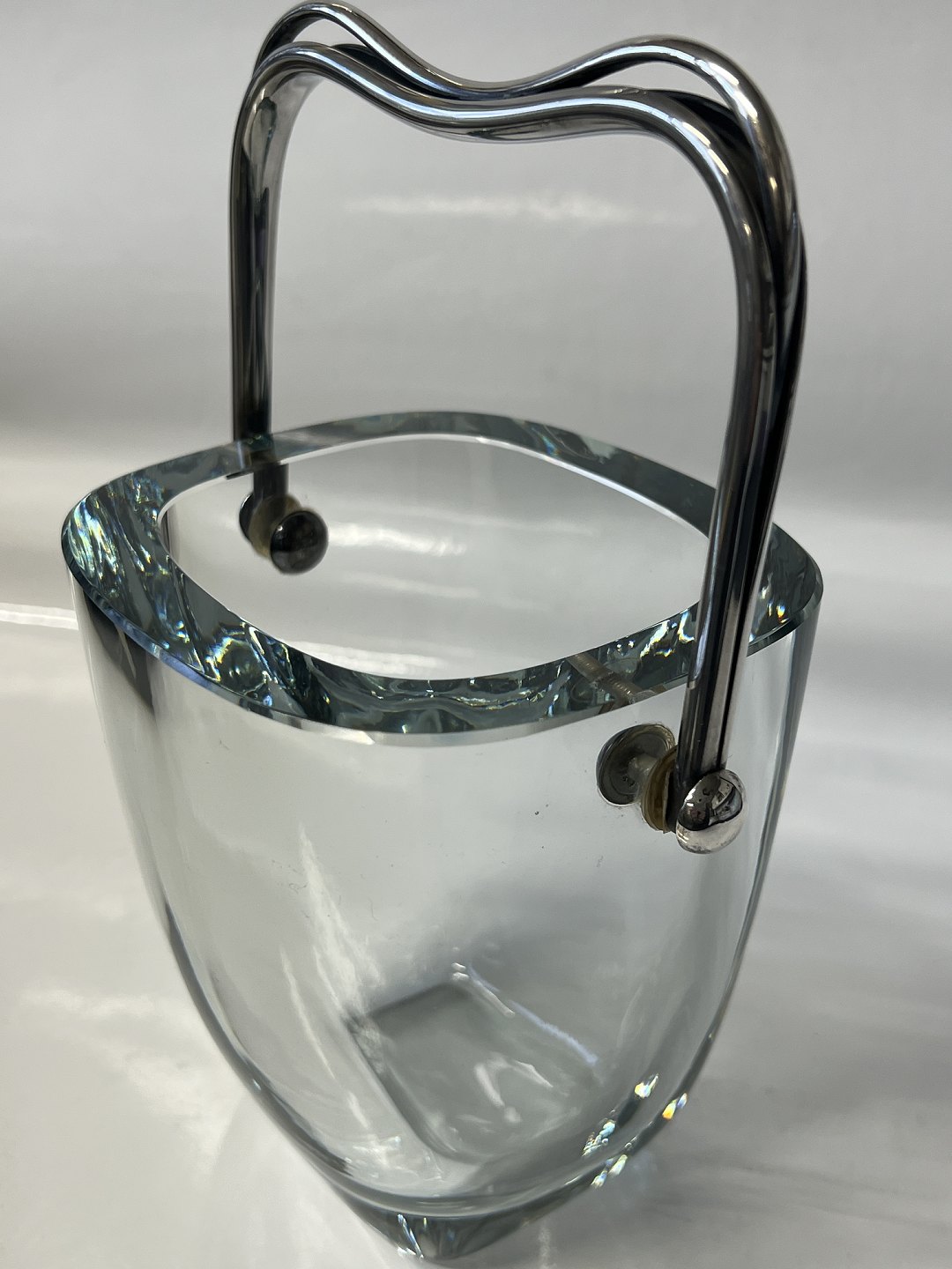 Ice bucket with silver mounting Stamped. 925s sterling. Height of glass 13 cm with Handle 22 cm. Width of glass 12 cm Length of glass 11 cm Perfect condition