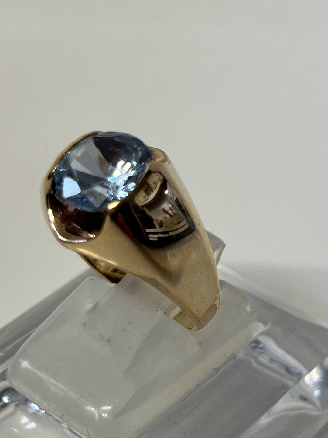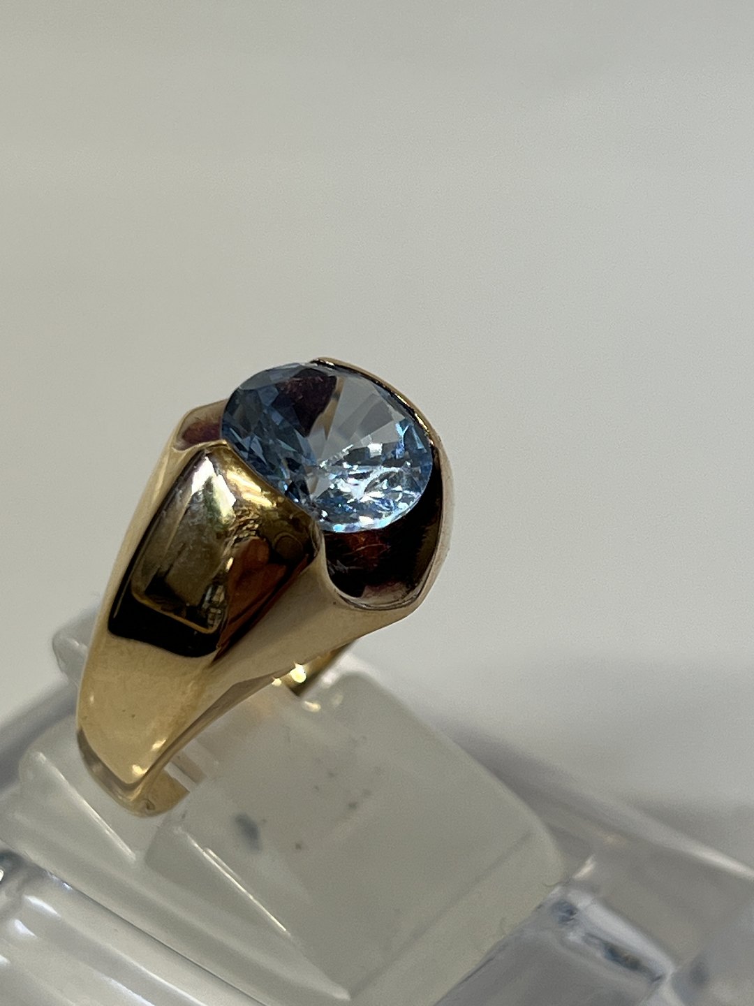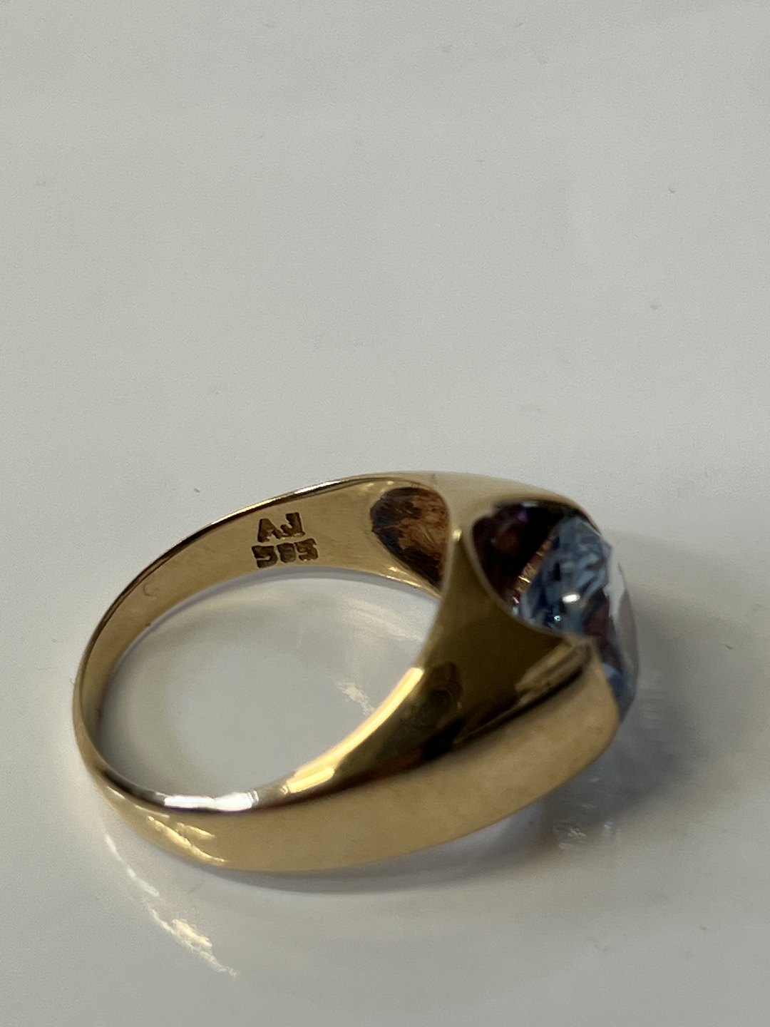 14 carat Gold Vintage Ladies Ring with light blue stone. Stamped: AJ 585. Size: 54. The ring has been inspected by a jeweler. The item is not physically available in the store, contact us for viewing.