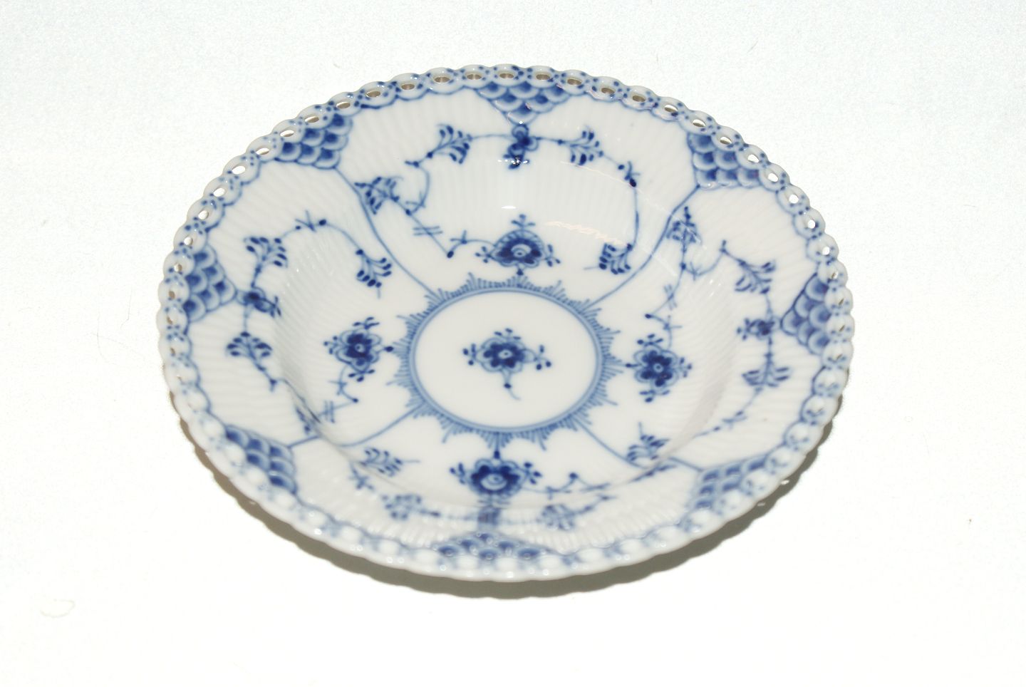 Kongelig Musselmalet Helblonde, Lille Dyb Tallerken, Jordbær mm Dek.nr. 1071 eller 601 2. Sortering Diameter 15 cm. Flot og velholdt stand.