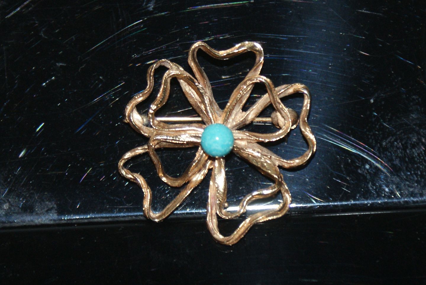 Broche med Tyrkis, 14 karat Guld Stempel: HS; 585 Størrelse 3,5 cm Smykket tjekket af guldsmed. Flot og Velholdt Smykket findes ikke fysisk i butikken, men kan fremvises efter ønske. Kontakt os gerne for en fremvisning.