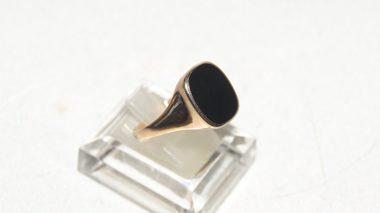 Signet ring med sort onyx i 8 karat guld. Stemplet JAA. 333 Størrelse 73 Pæn og velholdt stand Tjekket af guldsmed, Smykket findes ikke fysisk i butikken, men kan fremvises efter ønske. Kontakt os gerne for en fremvisning