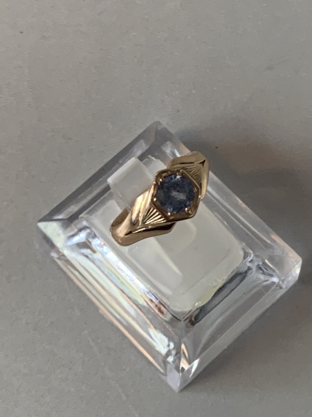 Damering med lyseblå sten i 14 karat Guld Stemplet 585 Størrelse 54 Pæn og velholdt stand Smykket tjekket af guldsmed Varen findes ikke fysisk i butikken, kontakt os for fremvisning
