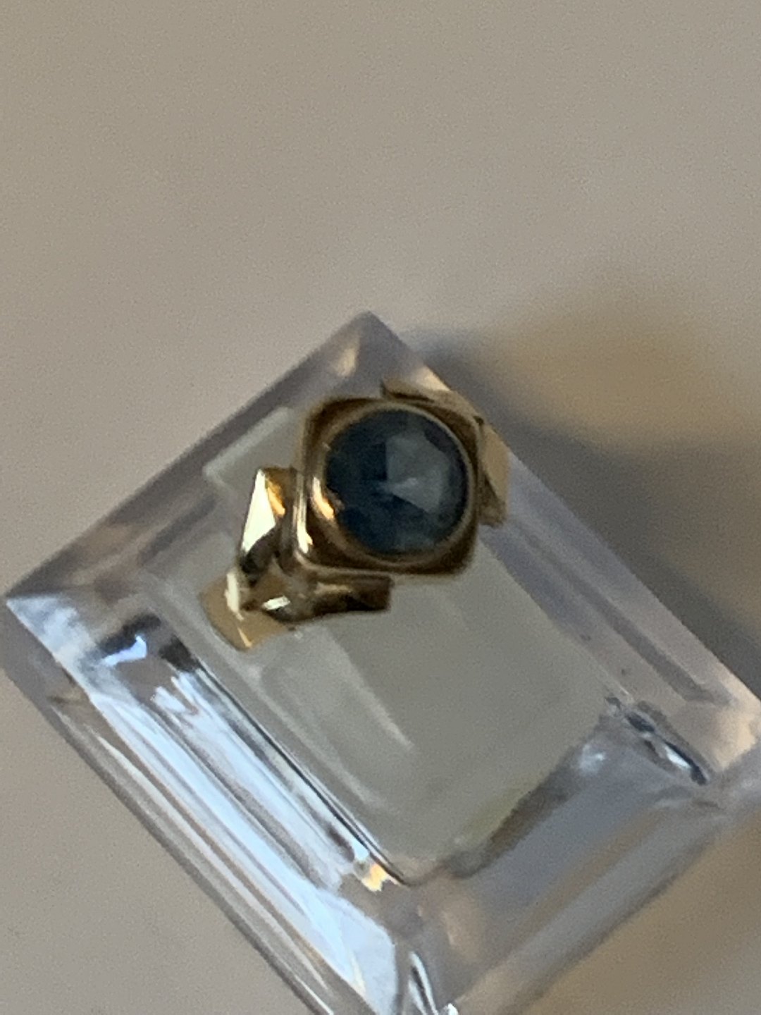 Damering med blå sten 14 karat guld Stemplet 585 Størrelse 51 Med brugsspor tjekket af guldsmed Varen findes ikke fysisk i vores butik så kontakt os for yderligere info eller fremvisning.