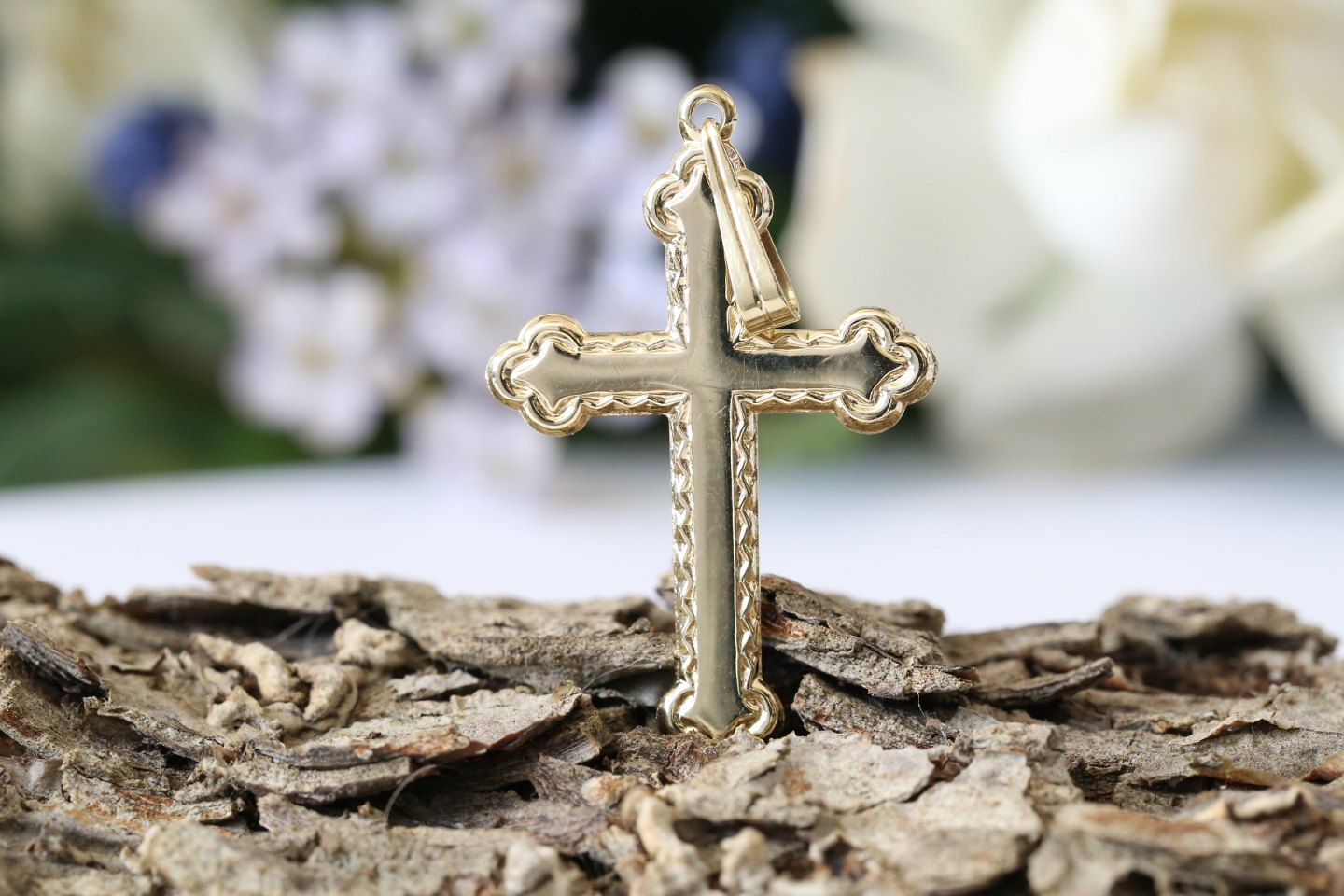 Ikonisk guldkors i 14 karat guld, med flotte ornamenteringer. Korset er udført med sans for detaljen, og ideelt i en gulkæde om halsen. En smuk gave til barnedåben eller konfirmationen, der er en gave for livet.