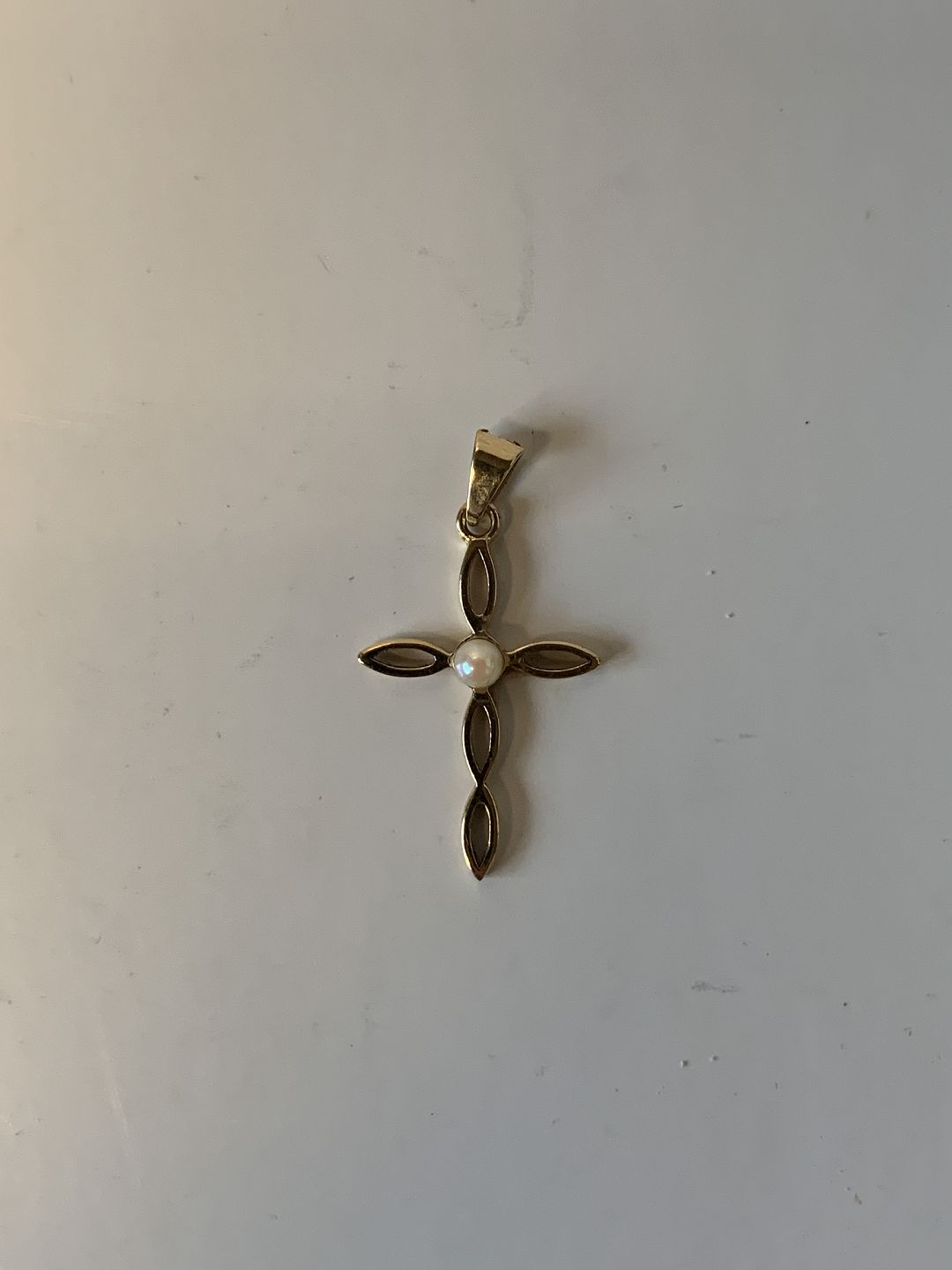 Guld Kors med perle 14 karat Guld Stemplet 585 BH Højde 27,83 mm Pæn og velholdt stand Varen findes ikke fysisk i butikken Så kontakt os for fremvisning