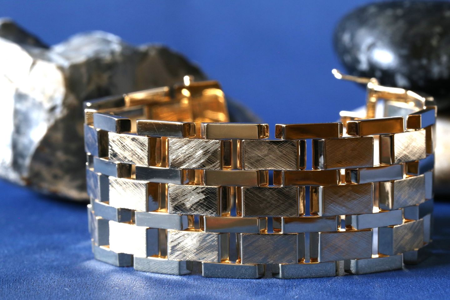 Dette blok guldarmbånd er et sjældent udbudt armbånd, da Ciseleringer giver armbåndet en unik identitet. Armbåndet består af 7 rækker, hvoraf de 3 er brede blokke med ciselering.