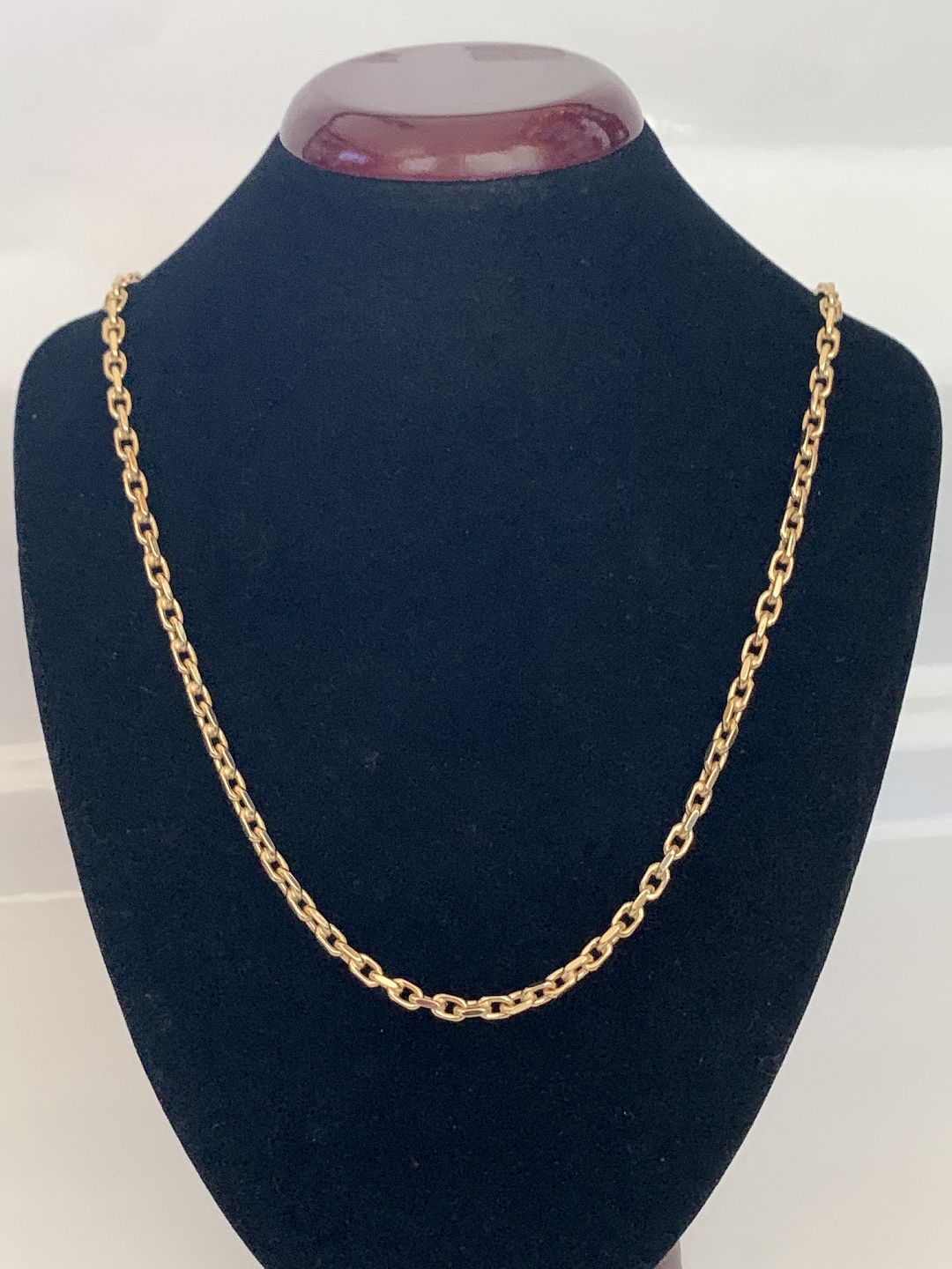 Flot guldkæde i Anker facet, smedet i 14 karat guld. Kæden er elegant og simpelt udformet. De små led gør at kæden falder blødt om halsen, og er behagelig at bære. Da kæden er tynd, vil den passe til mange forskellige vedhæng. Vi har hos Antikhuset et bredt udvalg af vedhæng til guldkæder. Dette udvalg kan du se her: https://www.antikhuset.net/katindex.asp?kukat=12179