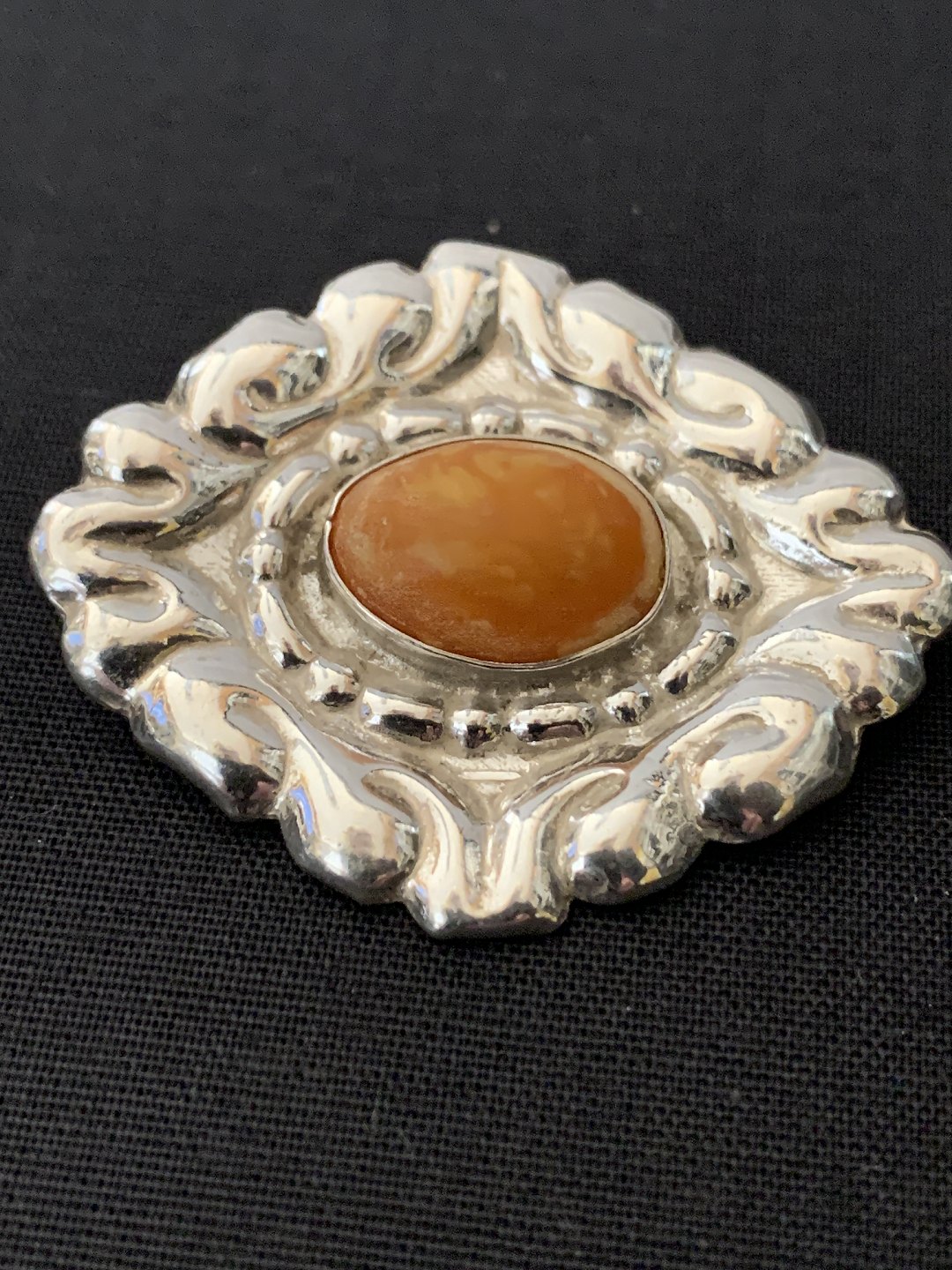 Flot og unik sølvbroche med mange flotte detaljer og ornamenteringer. Det giver denne broche et elegant udseende, der vil passe til en flot trøje. De mange ornamenteringer omkring det smukke stykke rav, gør brochen levende.