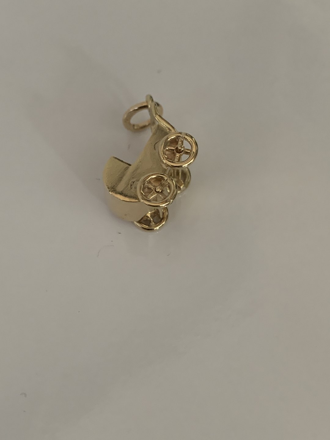 Beautiful and discreet pendant, designed as a pram in 14 carat gold. Suitable for a necklace or as a pendant in a bracelet. Beautiful minimalistic and classic piece of jewelry that has been used for many years.