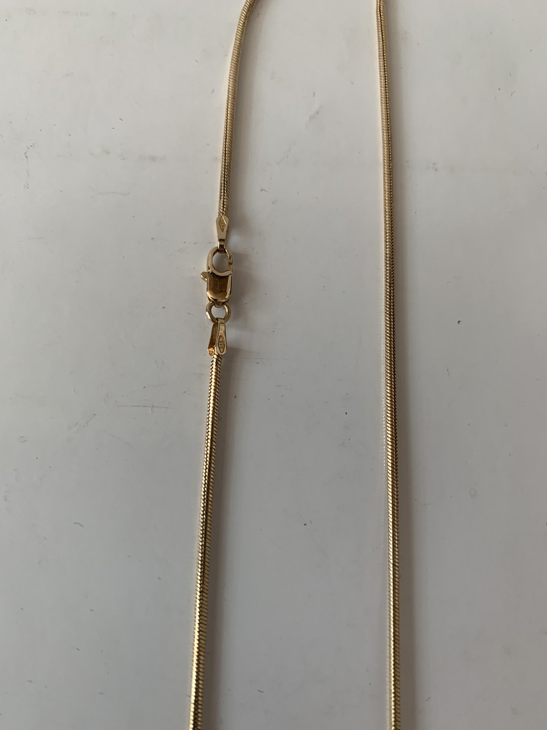 Fin guldkæde i 14 karat guld, der vil være velegnet til et stort udvalg af vedhæng. Brug den f.eks. til et lille dagmarkors eller andet ikonisk vedhæng. Guldkæden er en slangekæde, med flot design og udtryk.