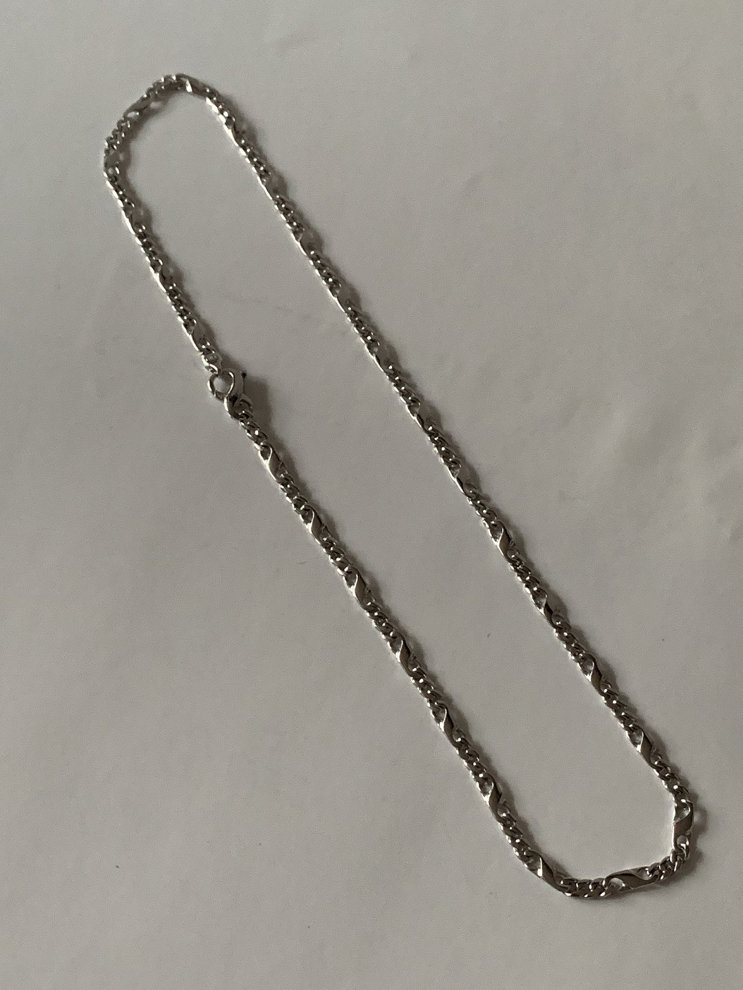 Flot halskæde i 14 karat hvidguld, med stilrent mønster. Guldkæden er sammensat i en kombination af større og mindre led, der giver behagelig komfort, der samtidig lægger sig blødt om halsen. Guldkæden har karabinlås, hvilket gør den let at bruge til hverdag. En enkel, men samtidig meget elegant halskæde.