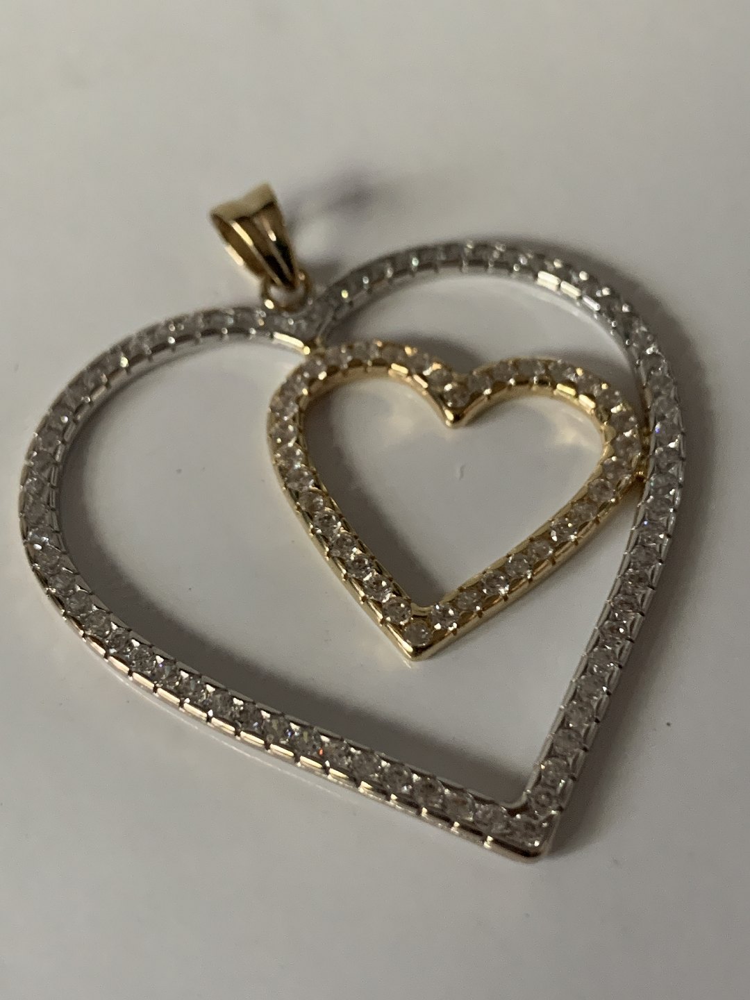 Hjerteformet vedhæng i 14 karat rød- og hvidguld med sten.