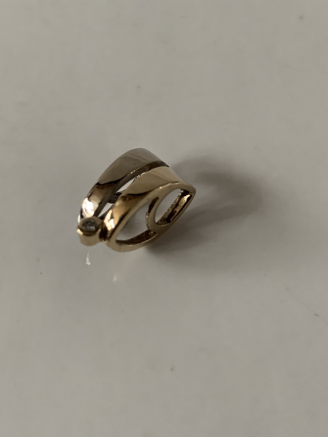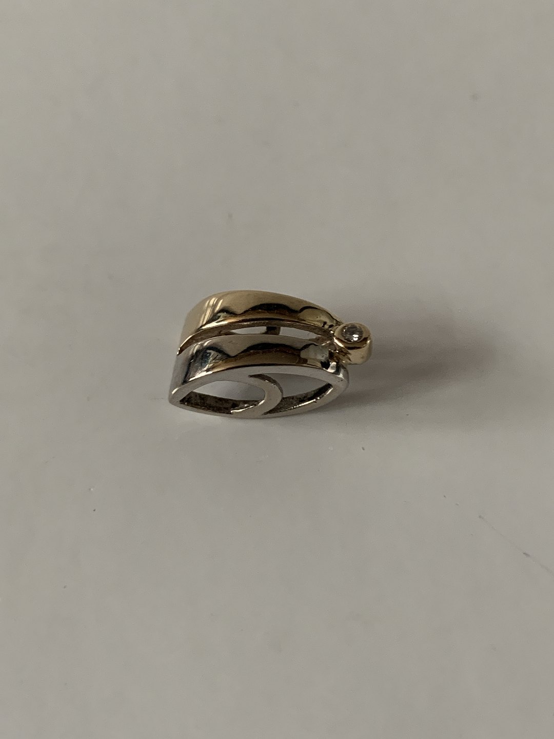 Dette flotte vedhæng, er udført med sans for de mindste detaljer. Vedhænget er smedet af hvid- og rødguld, i flot tidløs buet form. Den indlagte brillant giver vedhænget en flot glans, der udstråler god stil og klasse. Kan det med fordel kombineres med en tykkere guldkæde.
