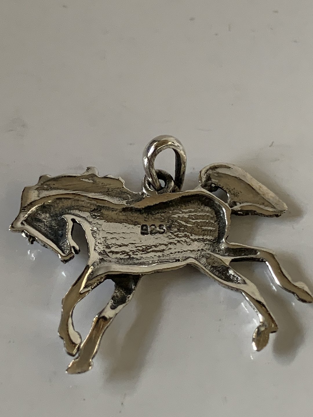 Vedhæng/Charms i sterlingsølv motiv Hest. Måler 26,05 mm bredde. Højde 18,29 mm 22,87 mm med øsken. Perfekt stand.