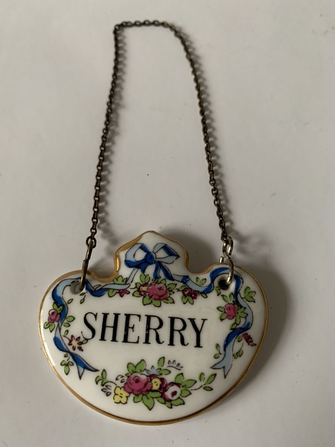 Flaske / Karaffel Sherry skilt med kæde Stemplet Stafford Shine England Størrelse 5,3 x 4,2 cm. Flot og velholdt stand