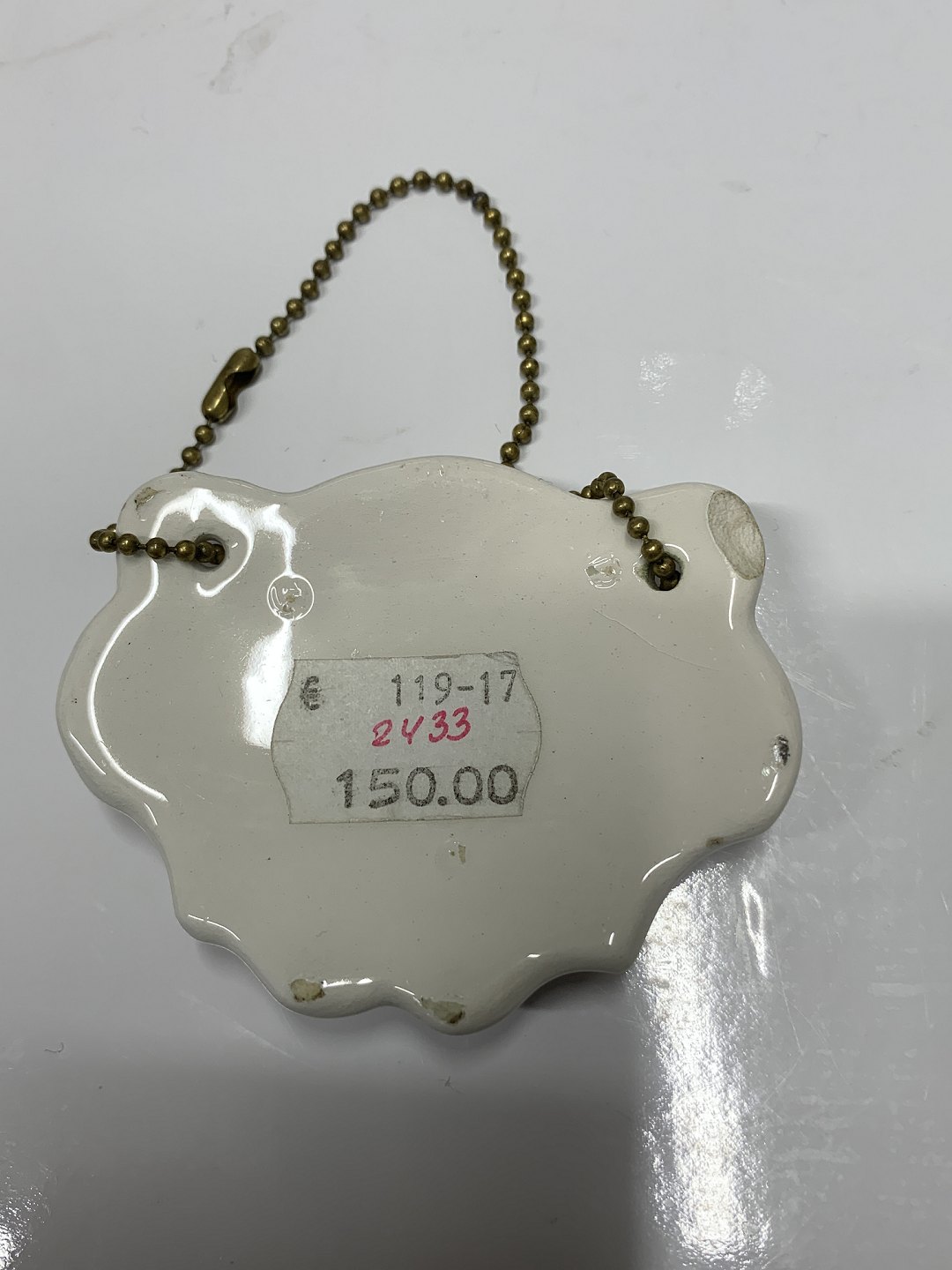 Flaske / Karaffel Vermouth skilt med kæde Størrelse 7 x 5,5 cm. Lille skår på bagsiden se foto ellers velholdt stand,