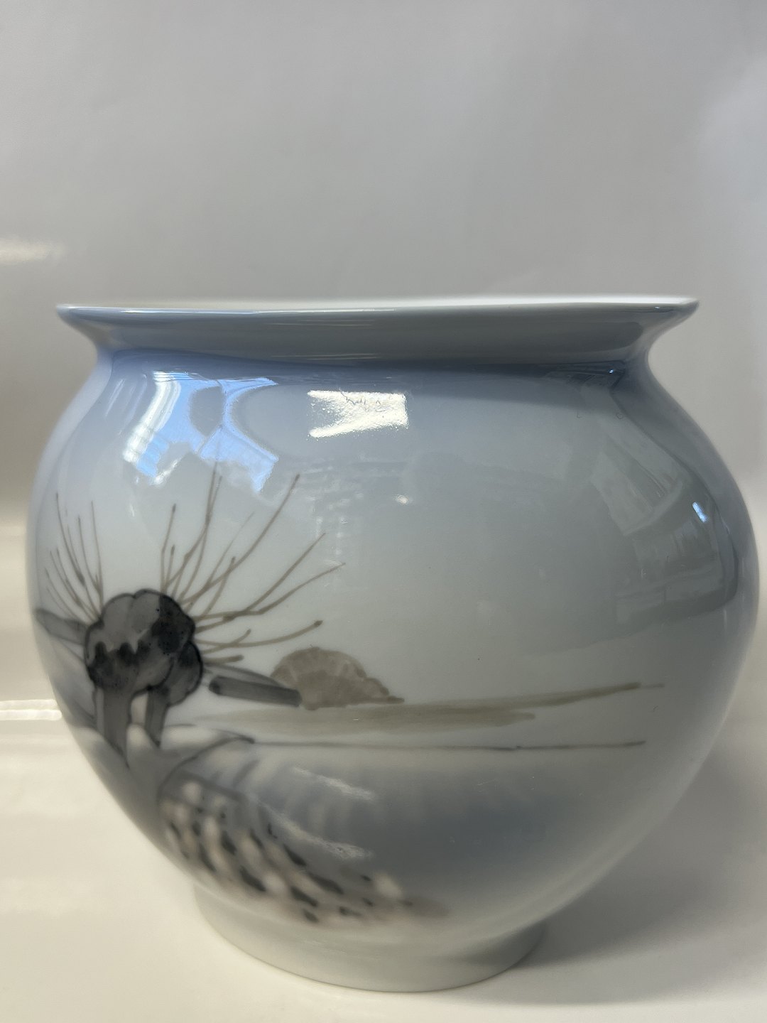 Oval Lyngby Vase med snelandskab. Dekorationsnummer 75/180. 1. sortering. Højde .12,5 cm. Længde 14 cm. Perfekt stand.